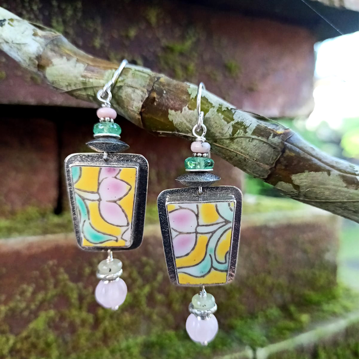 Antique Chinese Pottery Shards Set In Sterling Silver Texture Bezel, Combine With Hand Carved Pink Rose Quartz Beads And Hand Made Sterling Silver Beads.